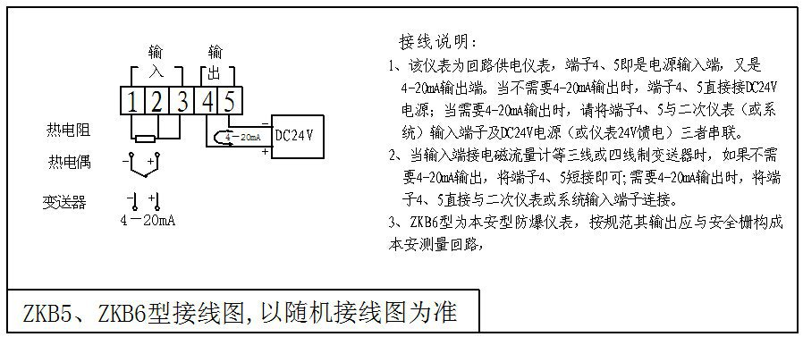 该表是一款回路供电仪表,其电源接线端带有4~20mA变送输出,可与二次仪表或DCS、PLC系统构成安全区测量显示或控制系统。