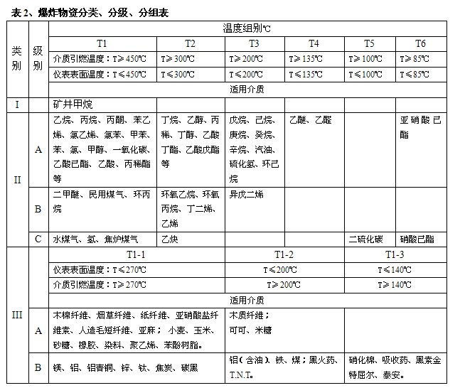 4.4、爆炸物温度组别:按不同爆炸物最低引爆温度将爆炸性气体分为T1至T6共六组(详见表2)。